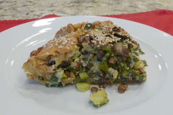 The filling for this pie could easily be used for a gratin if you don’t feel like putting it into a pastry casing. It is important to cut the zucchini into a small dice for the best texture and look. You can use a number of different greens for this. I cooked the lentils in some vegetable broth just for added flavor.