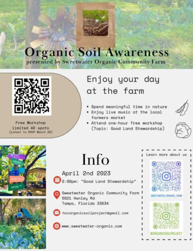 Join us April 2, 2023 for a presentation on Organic Soil Awareness. The one-hour class is FREE, but seating is limited and individuals must register below by scanning the QR code to attend. Rick Martinez will offer a discussion on the negative global impact of unsustainable farming methods and the benefits and challenges of good land stewardship. In addition, Darren Nuznoff will offer some tips on container gardening in an urban setting and Scott Gunsaullus will provide information on local resources for community gardens. A free tour of Sweetwater Organic Community Farm is also available prior to the class, beginning at 1:00 PM, meeting at the fire circle.