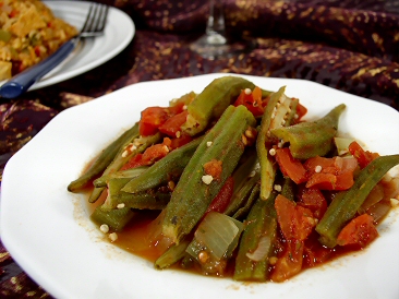 Heat a large non-stick skillet rubbed or sprayed lightly with olive oil. When it’s hot, add the onion, bell pepper, and celery and sauté for about 3 minutes. Add the okra and garlic and cook, stirring, for about 5 minutes, until the okra is beginning to brown. Add the remaining ingredients, reduce the heat, and cover. Cook for 10 more minutes. Remove the bay leaves and serve alone or with rice.