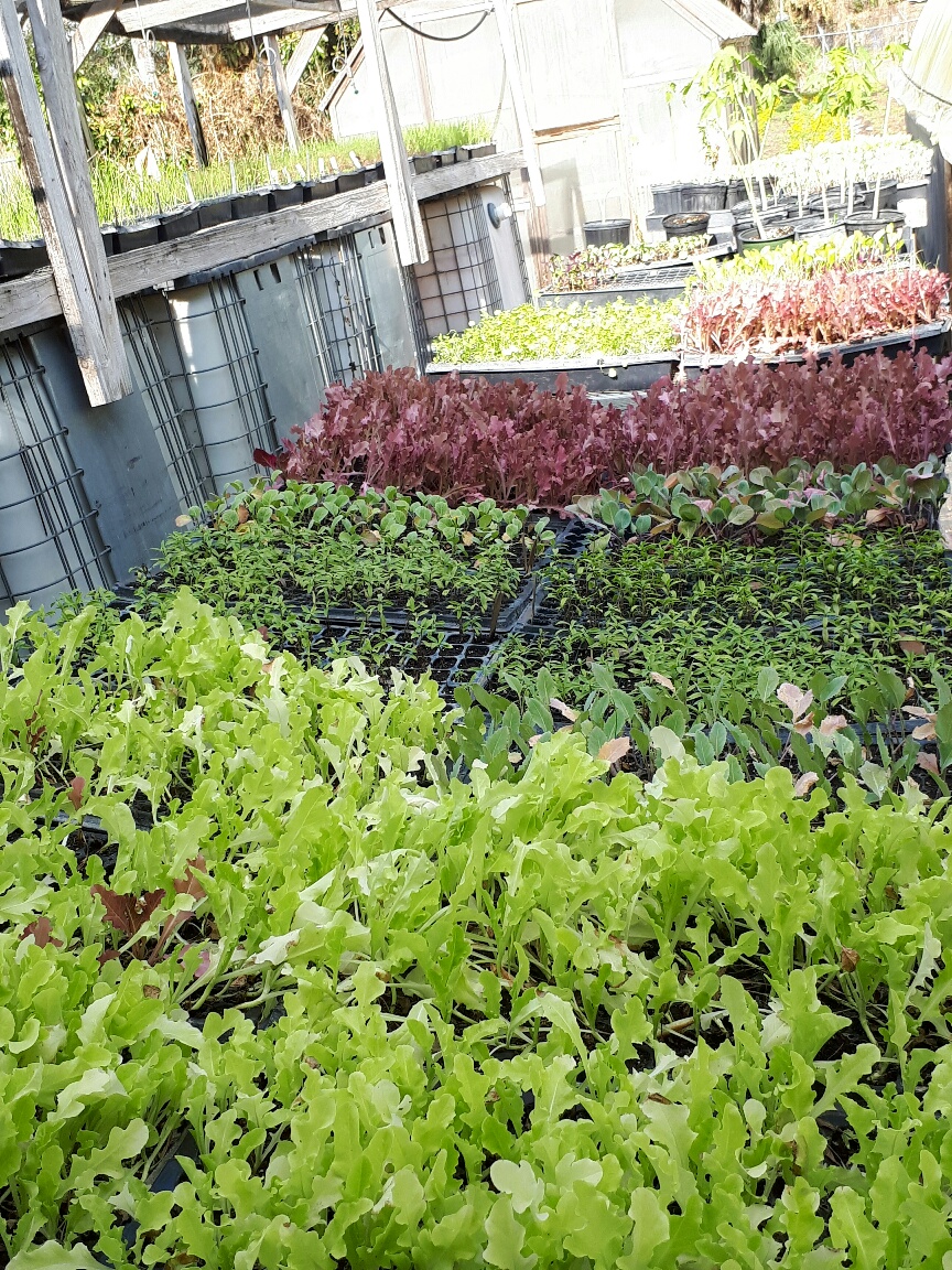 This is our hardening shed, or transition area. Think of the greenhouse like nursery school. The baby plants have everything controlled for them – food, water, temperature. When they’re old and strong enough to go outside, we transfer them to the hardening shed. This is more like middle or high school – we still control their food and water, but they’re a little more free to spread their wings and grow strong and hardy. They’re teenagers (thankfully, without the usual moodiness). Finally, we send them off into the real world, or plant them in the fields, to grow big enough to harvest and bring to you at the market or in your share!