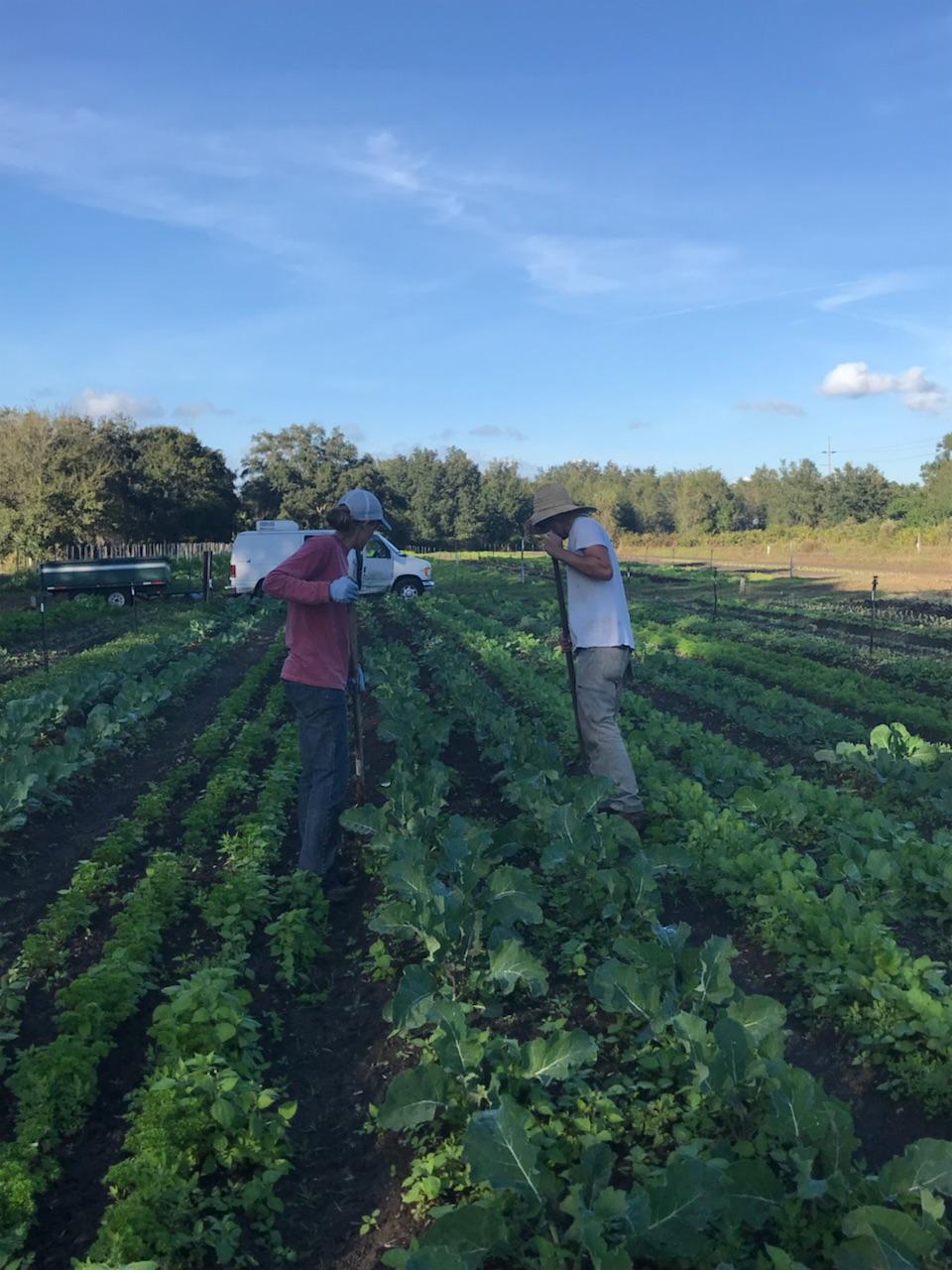 Kyle and Lexi are busy scuffle hoeing (or scuffling, as we usually call it)! A scuffle hoe is used in a back-and-forth “scuffling” motion to eliminate young weeds before they have a chance to grow a stronghold. The hoe is designed to keep you upright, so it’s much easier on your back, and it won’t damage the surrounding plants. It’s ideal for the loose, sandy soil we have here in Florida.