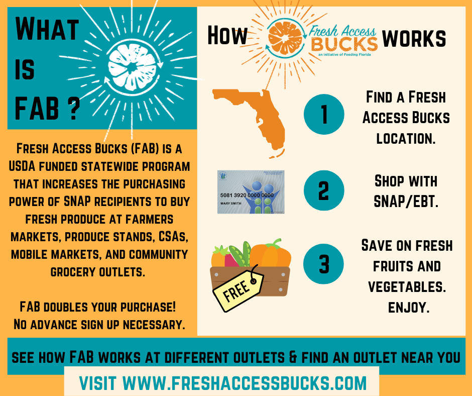 At the Sweetwater Sunday Market $20 in SNAP dollars buys you up to $40 in Florida-grown Produce at the Sweetwater produce stand and other participating vendor booths where Florida-grown vegetables and fruits are sold. This “double incentive” program, called “Fresh Access Bucks” (FAB) is a program initiated by Feeding Florida, who received a Specialty Crop Block Grant to increase sales of Florida grown fruits and vegetables to Florida consumers.