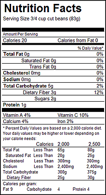 The following nutrition information is for 3/4 cup of green beans (83 grams).